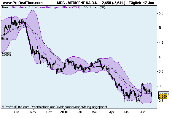 18.06.2010 (www.4investors.de) - Der gestrige Handel hat für die Medigene-Aktie einen Kursverlust von 3,6 Prozent gebracht. Der Schlusskurs liegt mit 2,65 Euro nur knapp über dem Tagestief, das bei 2,62 Euro notiert ist. Aus charttechnischer Sicht ist das Verkaufssignal zu beachten, das mit dem Rutsch unter den Unterstützungsbereich oberhalb von 2,73 Euro zustande gekommen ist. Wird dieses Signal nicht kurzfristig kompensiert, weist der kurzfristige Trendpfeil nach unten mit möglichen Kurszielen bei 2,55 Euro sowie bei 2,39/2,46 Euro.