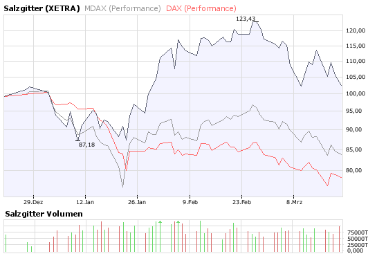 Ein weiterer Pluspunkt ist eine mögliche Aufnahme der Salzgitter-Aktie in den DAX. Der nächste Verkettungstermin findet im Juni statt. Schon jetzt erfüllt Salzgitter die für eine DAX-Aufnahme notwendigen Kriterien bei Marktkapitalisierung und Umsatz. Mit K+S gibt es nur einen ernsthaften Konkurrenten um den DAX-Aufstieg. Potenzielle Absteiger gibt es mit Infineon, Hypo Real Estate und TUI gleich mehrere. Zwar ist eine DAX-Aufnahme nicht sicher, aber möglich.