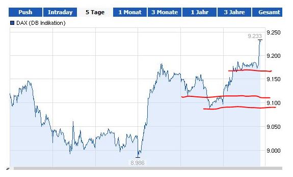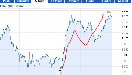 auch wenn es hier eher um den technischen aspekt geht, ist es vielleicht ganz interessant welche bewegungen der dax an tagen wie diesem gemacht hat. erst stark up um dann wieder zu fallen.