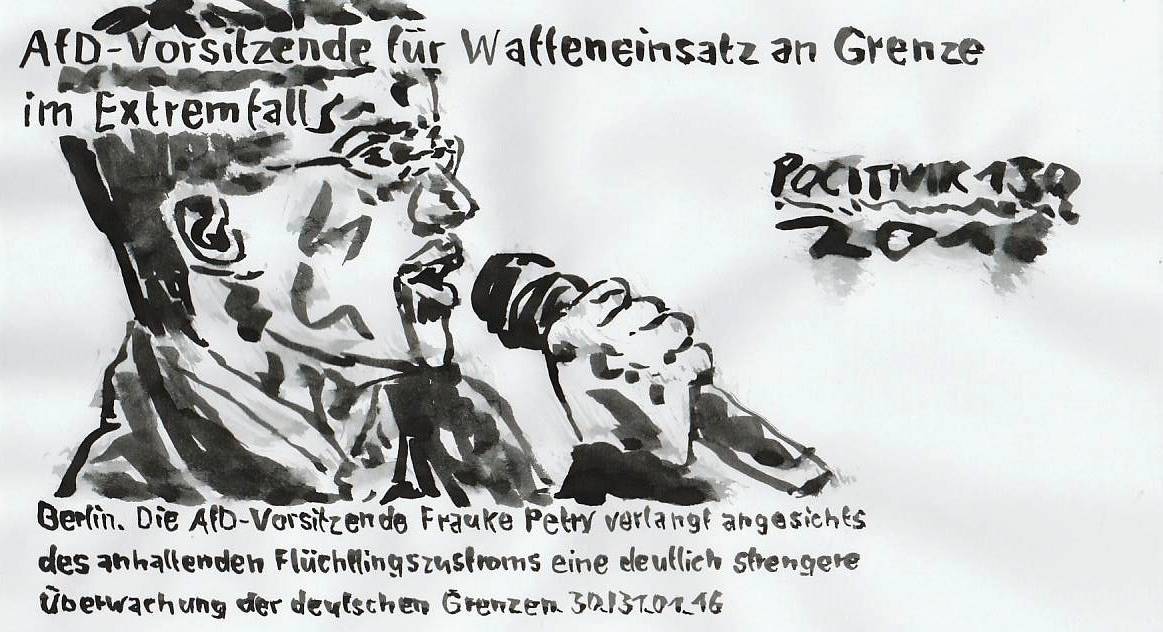 POLITNIK 130 "Wir brauchen umfassende Kontrollen, damit nicht weiter so viele unregistrierte Flüchtlinge über Österreich einreisen können", sagte Petry der Zeitung "Mannheimer Morgen". Notfalls müssten Polizisten an der Grenze "auch von der Schusswaffe Gebrauch machen. So steht es im Gesetz", sagte die Vorsitzende der rechtspopulistischen Alternative für Deutschland. 31.01.16 https://www.facebook.com/mario.meierhof