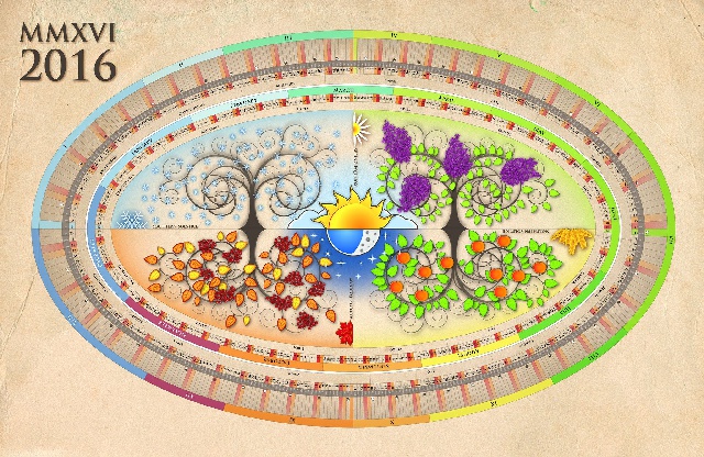 Der Kalender besteht aus zwei Kalender: der äußere Kalender basierend auf der Fibonacci-Folge (13 Monate) und dem gregorianischen Kalender beginnt am 21 Dezember (Wintersonnenwende).