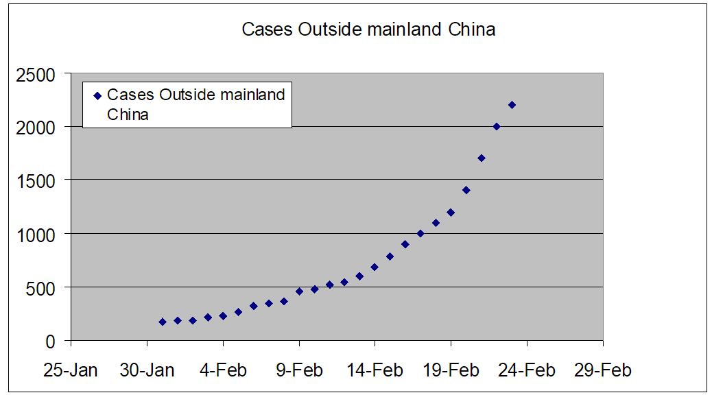 The rapid initial rise is concerning but not surprising. However, the size is much less than in China. Just like China, one should look for the deceleration sign or the begin of plateauing. In my personal opinion, I do not see an uncontrollable spread. Italy, Korea, etc are taking the necessary steps to control relatively lower cases compared to China.