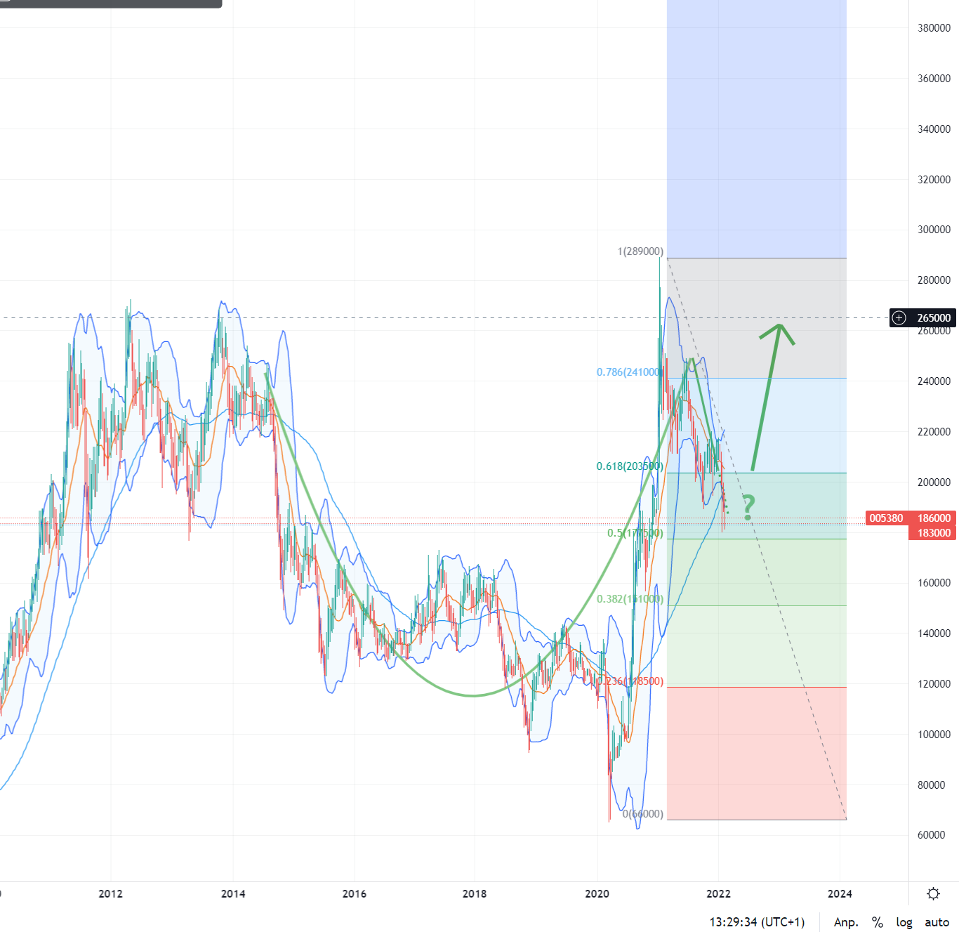 Im Bild das Update der Prognose aus dem Oktober, ich habe die grünen Linien mal unverändert drin gelassen. Das Fragezeichen kannst Du jetzt in die untere Hälfte des grünen Retraces schieben.
