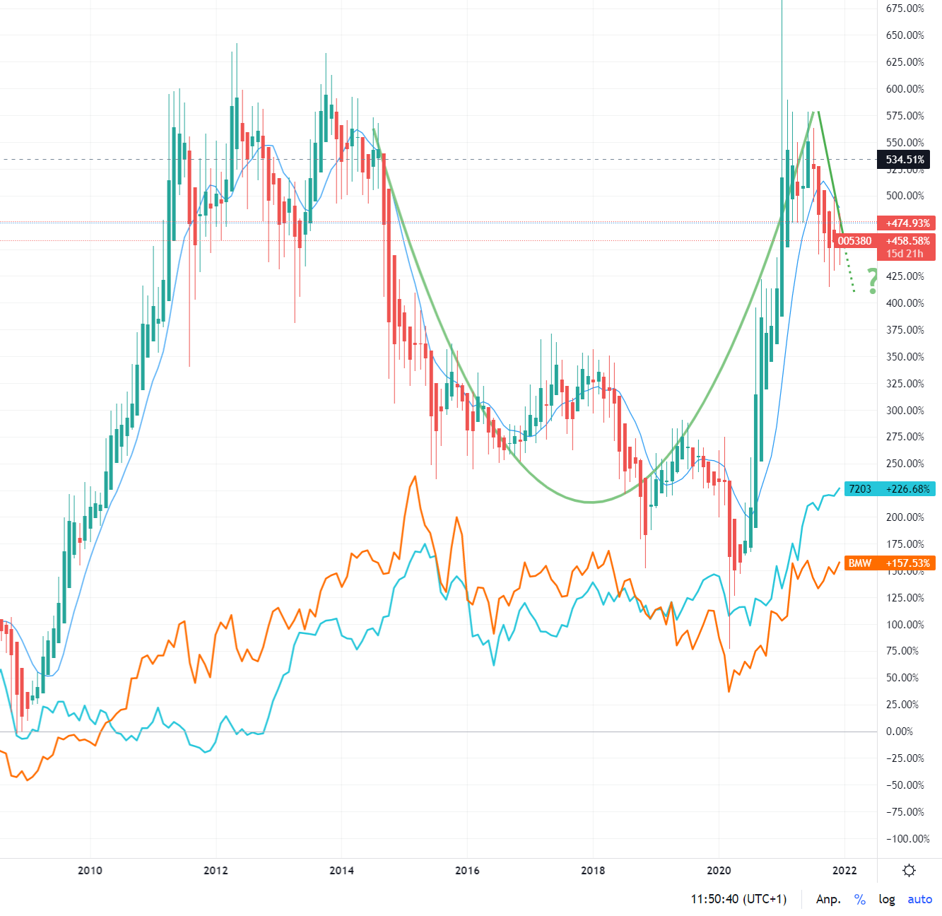 Im Bild der Vergleich zu BMW und Toyota (blau). Wenn man jetzt dazu bspw. BYD oder eine andere Elektrobude einfügt, springt deren Kurs mit ca. 1000% aus dem Bild.