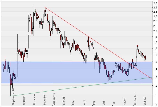 Was sagt die Charttechnik? Nachdem der seit Anfang des Jahres bestehende Abwärtstrend Ende August gebrochen wurde und der CFO kurz darauf Aktien gekauft hat, konnte die hartnäckige Barriere bei 1,50 nachhaltig überwunden werden und der Kurs konnte fast 20 % zulegen. Seitdem geht es nachrichtenlos wieder nach unten, der Kurs nähert sich wieder der 1,50 Marke, die diesmal als Unterstützung dienen sollte.