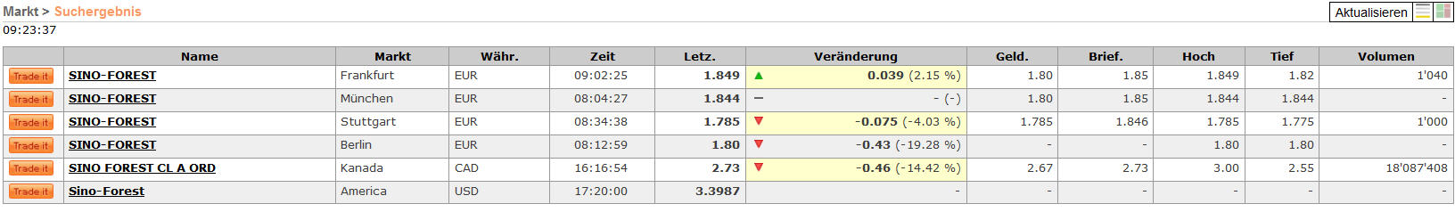 Mr. Block von MuddyWaters hat eingeräumt, dass er kräftig Leerverkäufe auf Sino-F. getätigt hat: Das mache er stets so, wenn er eine Expertise erarbeite. Diese ist dann noch vor ihrer Veröffentlichung verschiedenen hedge-Fonds zugespielt worden. Ein Analyst hat bei Bloomberg dazu gesagt, er habe die Besitztümer von Sino-F. in China nahezu jährlich besucht und halte Sino-F. für ein "solides Unternehmen". - Es handelt sich also offenbar um eine short-Attacke, an der die Urheber verdienen wollen. Sino-F. ist immer wieder von Wirtschaftsprüfungsgesellschaften durchleuchtet worden, ohne dass derartiges gefunden wurde, was angeblich Mr. Block bei MuddyWaters gefunden haben will. Sino-F. ist jetzt - am 20.6.11 - auch dem Artikel in der kanad. Zeitung entgegen getreten und hat auf der Web-Site die Ländereien in China aufgelistet und beschrieben, die zu Sino-F. gehören. Sino-F. arbeitet zwecks Aufklärung der Sache mit der kanad. Börsenaufsicht zusammen. Credit suisse empfiehlt Sino-F. weiterhin mit "outperform" und hohem Kursziel.
