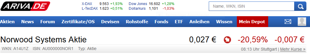 Kursrückgang von 0,11 auf aktuell 0,034 http://www.ariva.de/forum/Norwood-Systems-530148