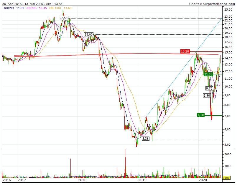 nach einem kräftigen Abstieg, erstmal eine Nummer zu groß. Denn diese letzte Marke, sollte nicht ohne Rücksetzer genommen werden. Fallen diese 15€, ist bis 25€ kein Widerstand in Sicht.