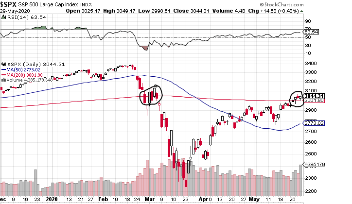 1.) Tages-, Wochen- und sogar Monatsschlusskurs (!) per letztem Handelstag im Mai war oberhalb der viel beachteten 200 Tagelinie (rote Linie im Chart). Das ist faktisch erstmal ein bullishes Zeichen, ja sogar ein Ausrufezeichen der Bullen. Ich hatte angenommen, dass der S&P500 am Freitag darunter beenden wird. Aber Trumps harmlose Rede hat für deutliche Erleichterung an den Märkten gesorgt. Warum man ausgerechnet jetzt trotz dessen short gehen könnte bzw. bleiben könnte, wäre einzig die Hoffnung, dass es ein Fehlausbruch nach oben war, ähnlich wie im März und im Chart eingekreist.