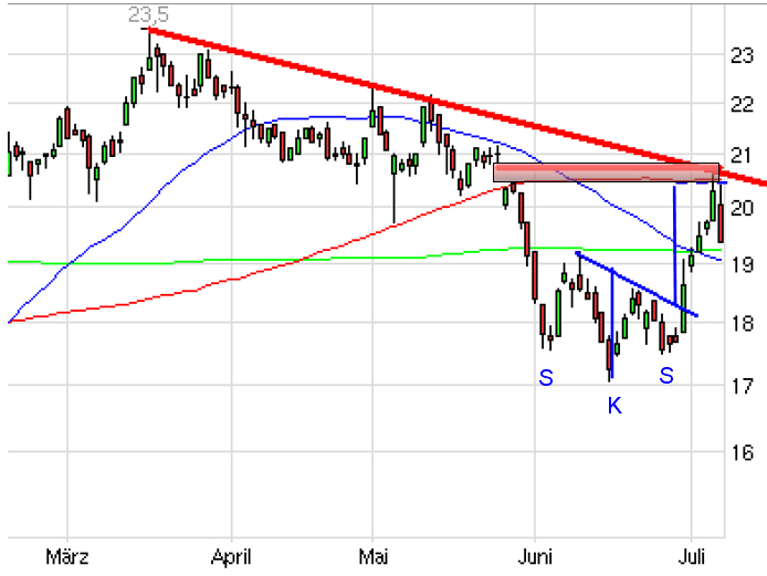 richtig interpretiere, gilt es noch ein gap von ende juni zu schließen : und zwar im bereich 18,60-18,90. bei erfolgsmeldungen und euphoriekäufen spielt es dann eher eine unterordnete rolle, aber für den chartisten ist da wohl der wadenbeisser.
