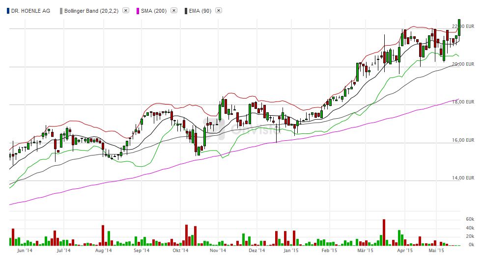 Die Analysten von Warburg Research rechnen derzeit damit, dass Dr. Hönle im kommenden Jahr bei Erlösen von 91 Mio. Euro auf ein EBIT von 12,5 Mio. Euro kommen kann. Das wäre deutlich mehr als das Vierfache des Betriebsergebnisses vom Jahr des Börsengangs. Gemessen daran wirkt die aktuelle Notiz also wesentlich bodenständiger. Warburg taxierte das Kursziel für die Aktie von Dr. Hönle zuletzt auf 22 Euro. Das scheint eine realistische Hausnummer zu sein. Interessant ist der Small Cap auch unter Dividendenaspekten. Sollte die Gesellschaft zur kommenden Hauptversammlung im Mai 2015 eine unveränderte Ausschüttung von 0,50 Euro je Anteilschein vornehmen, käme das Papier auf eine Rendite von immerhin 3,1 Prozent. In Kombination mit einem KGV von knapp zwölf kann man da nicht meckern. Die Chancen stehen also gut, dass der Titel das Niveau von Anfang 2001 endlich überspringt.