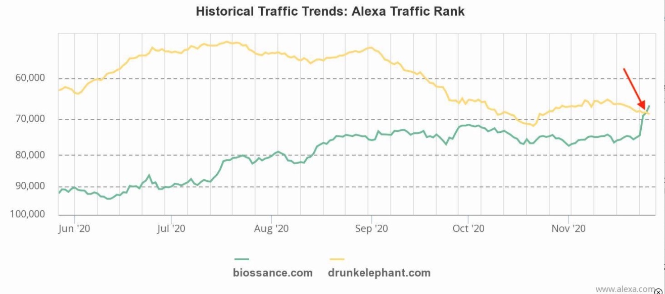 bei den zugriffen auf biossance - erstmals drunkelephant überholt - orderzahlen in den tageszahlen derzeit 200% über den vergleichbaren im november 2019 ... alexa liefert zwar immer nur punktuelle eindrücke - aber immerhin ...