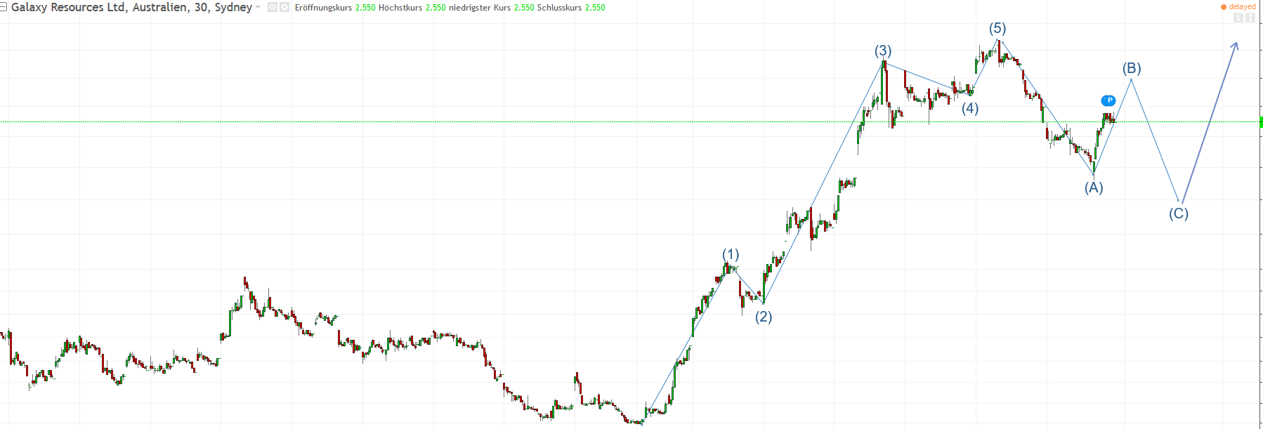 Aus reiner charttechnischer Sicht, die in dieser Phase wohl eine übergeordnete Rolle für die Kapitalsammelstellen zu spielen scheint, könnten wir die klassische Elliott Wellen zählweise anwenden. Dabei habe ich die 1. Große Welle analysiert und in ihre 5 Unterwellen mit anschließender ABC Korrektur unterteilt. Wohlgemerkt wäre das die 1.von 5 weiteren großen Wellen.Rechnet man das Ganze dann mit Fibonacci, dann dürfte es von Punkt C aus einen weiteren Schub von ca 2$ nach oben geben.Ich vermute stark, dass es noch morgen oder übermorgen einen Anstieg geben könnte, der dann wiederrum letzmalig abverkauft wird.