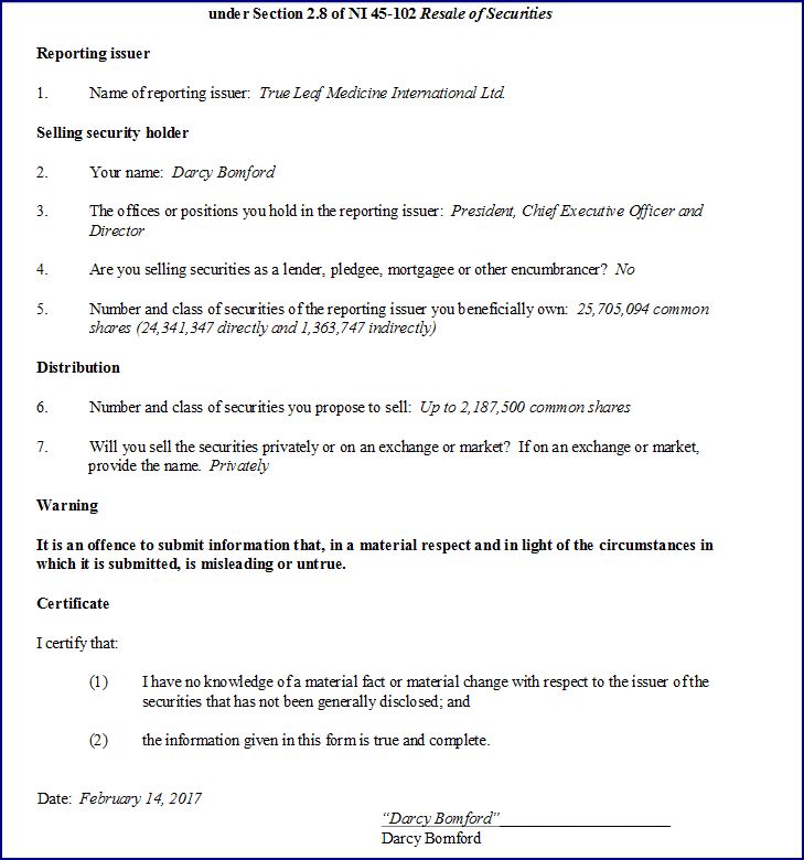 Dec 14/16 Aug 31/16 Bottomley, Kevin Direct Ownership Common Shares 51 - Exercise of options 250,000 $0.100