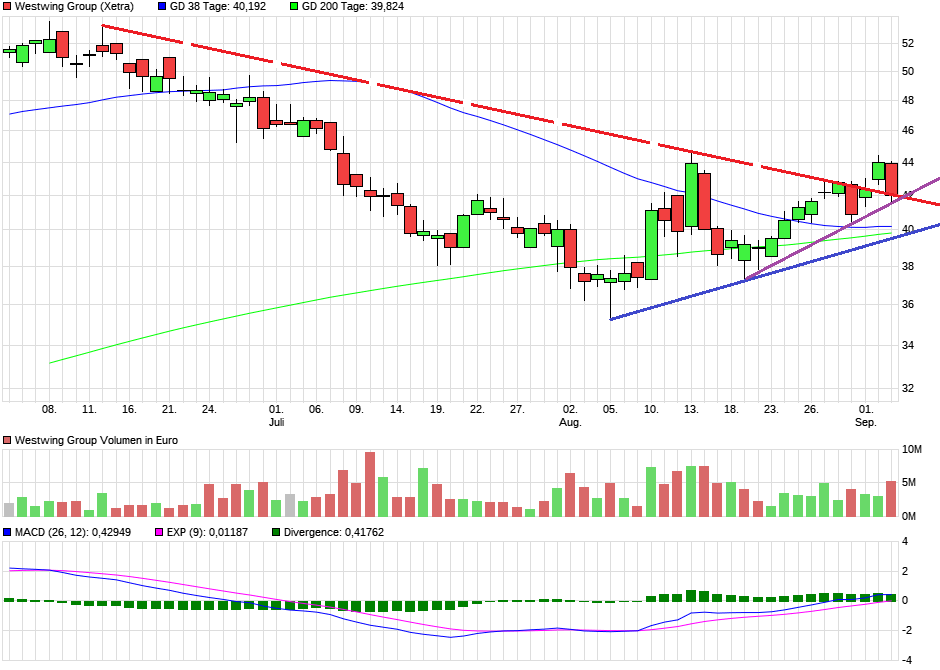 Kurzfristig bis gut 40 Euro wäre möglich dann wieder rauf Richtung 44,5 Euro.....Unter 40 Euro sollte es möglichst nicht gehen....zumindest nicht nachhaltig.....