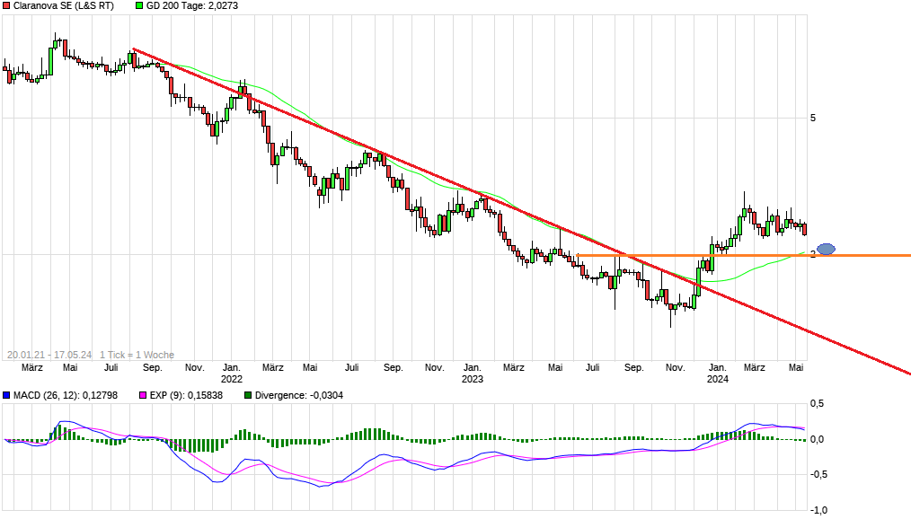Clara hat kurstechnisch ein fulminantes Halbjahr hinter sich. Der Aufwärtstrend muss mMn aber noch nicht zu Ende sein. Die Zwischentiefs sind noch ansteigend bis horizontal. Ein Absinken des Kurses auf 2€ würde einige Minima unterbieten, was einen zwischenzeitlichen Abwärtstrend einläuten könnte. Das sehe ich aber noch nicht, obwohl du sowas schon eingezeichnet hast?
