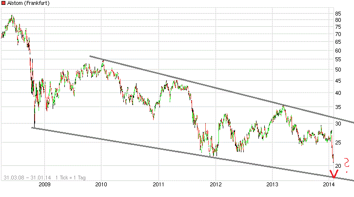 ...wird nicht ausreichen. Nebenbei -abgesehen von der sozialen Problematik- entsteht hier natürlich auch ein deutlicher Verlust an KnowHow -gerade in dieser Branche nicht unproblematisch- sowie ein Verlust an Image. Wenn erfolgreiche Verkäufe von Unternehmensteilen bekannt gegeben werden, um die Verschuldung zurückzufahren, könnte dies dem Kurs Auftrieb geben. Ein Wechsel an der Spitze des Managements käme bestimmt auch gut an. Wichtig wäre aber eine strategische Neuausrichtung z.B. im Kraftwerksgeschäft. Die Probleme kann man nicht locker auf eine "schwache Konjunktur in Frankreich" schieben, hier spielen massiv strukturelle Fragen mit rein wie z.B. die Energiewende usw. Diesen Wandel, weg vom reinen Atomkonzern, hat AREVA besser hinbekommen. Das stimmt. Wenn Alstom am 7.Mai, bei der Bekanntgabe der Jahreszahlen, positive Nachrichten bringt, könnte ich mir eine Kurserholung von 10 bis 20% im zweiten Halbjahr vorstellen. Mit der Bekanntgabe einiger luscher Aufträge ist es aber diesmal nicht getan. Vor allem wird es auf die Entschuldung und Konsequenz bei der Restrukturierung ankommen. Wenn sich Hollande zu stark einmischt, kommt sowieso nur Mist raus.