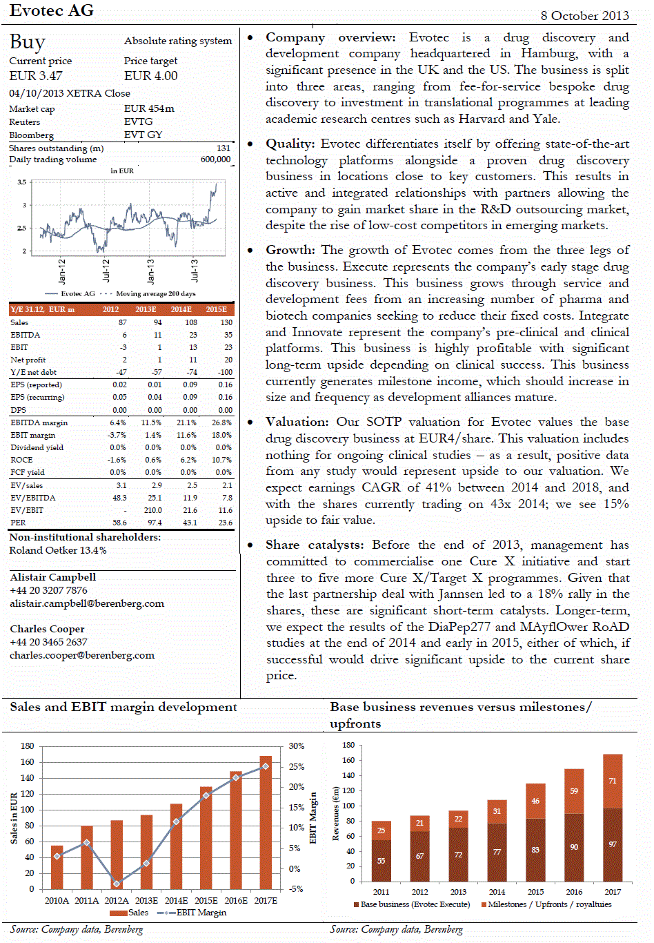 auf Schußkursbasis verteidigen. Meinetwegen kann man das Eröfnungsgap in der kommenen Zeit ruhig nochmal intraday schließen. Ein Pullback wäre harmlos. Entscheident ist nur sich anschließend wieder an dem bisherigen hartnäckigem Widerstand nach oben zu orientieren. Hier nochmal die Statements der Berenberg Bank vom 8.10. zu EVO
