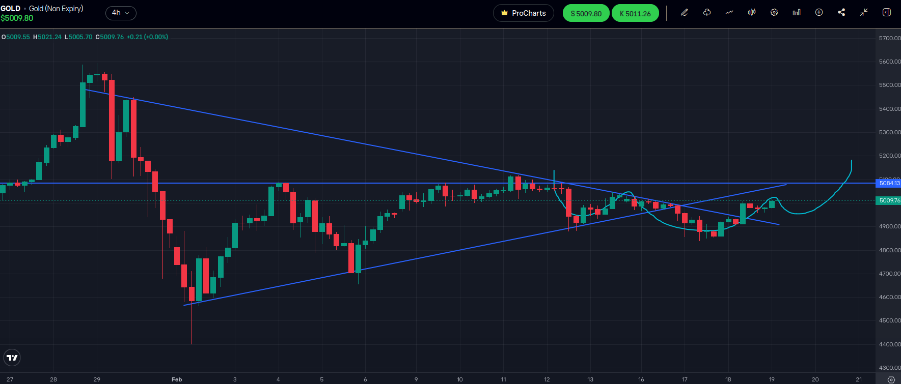 Im Bild die Gold-Dreiecke (4h-Chart), und eine mögliche inv. SKS, die sich kommende Woche auflösen könnte.