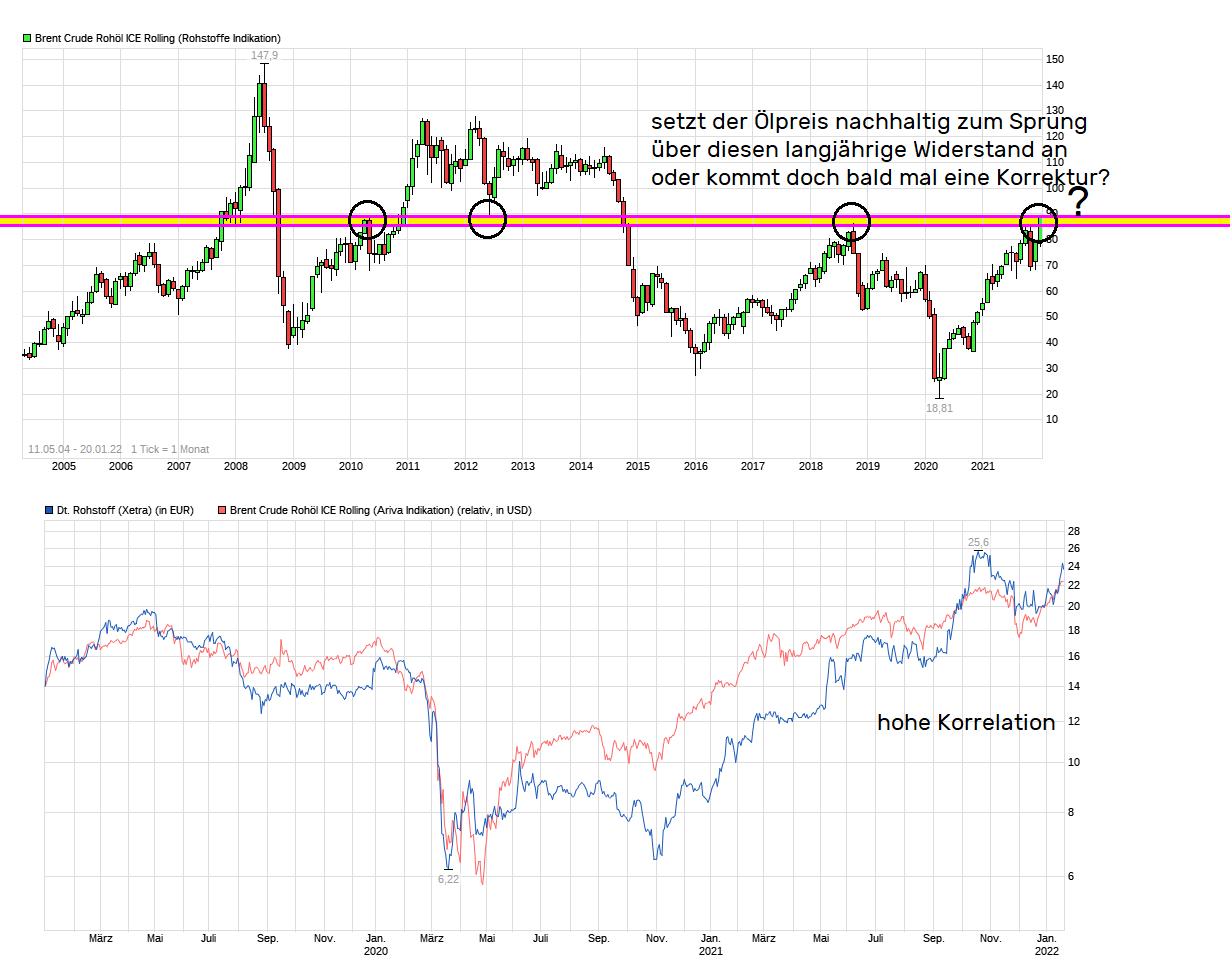 Egal wie gut das Q.4 21 war oder das laufende Q.1 22 auch ist bei Deutsche Rohstoff, genauso könnte es z.B. im 2.Hj.22 auch schon wieder andersrum laufen. Entsprechend fliegt man hier eben nur auf Sicht. Solange die Ölpreise steigen => Gewinne bei der Aktie laufen lassen. Hat man den Eindruk die Ölpreise haben ihr Top erstmal wieder erreicht und es gibt zuviel Produktion bei zu wenig Nachfrage, dann muß man hier bei Aktie auch wieder zügig raus. Ist eine Aktie wo man halt immer weiter zeitnah schauen muß wie die Lage ist. Und aktuell ist man ja an einer sehr wichtigen Stelle angekommen im Ölpreis-Chart, wo sich jetzt beweisen muß, ob man die Tops von 2018 nachhaltig rausnehmen kann oder nicht. Davon dürfte eben auch abhängen, ob die Aktie der Deutsche Rohstoff noch rennt wie in den Vormonaten oder ob auch hier dann mal wieder Atempause angesagt ist.