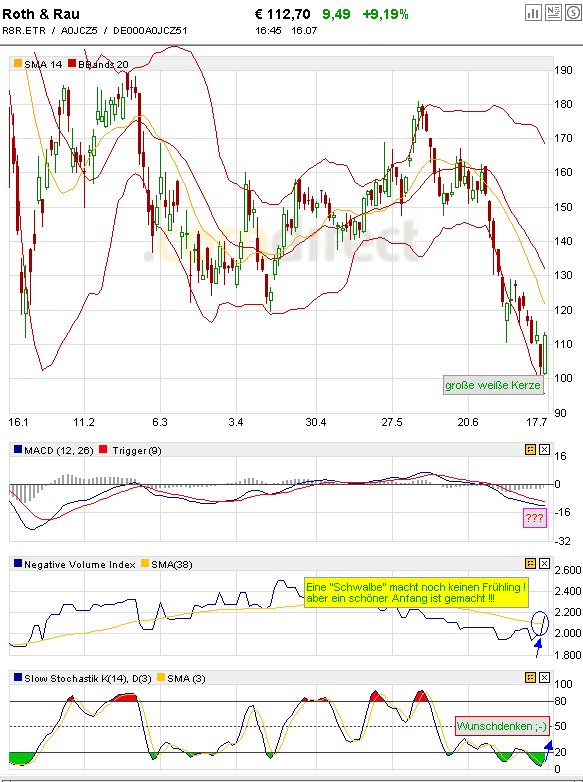 bin verwundert warum, der kurs ganz und gar nicht an die entwicklung der vortage partizipiert. in den letzten tagen hatte sich r&r stark mit den bewegungen des dax bewegt, heute ist gar keine bewegung zu erkennen, leicht schwächer, ohne große umsätze und das bei sehr guter TecDax performence sowie dem gesamtmarkt.