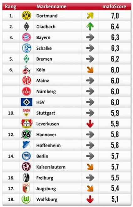 1. Platz: Borussia Dortmund. Auch wenn Bayern München noch bekannter und differenzierungsstärker ist als Borussia Dortmund – beim Image kann kein anderer Verein dem BVB das Wasser reichen. Der Abstand zum Zweiten ist gegenüber der Hinrunde sogar noch größer geworden. Der BVB überragt wieder als attraktiver, dynamischer und moderner Fußballverein mit großer Tradition. Die Fans meinen, dass der BVB „ein gut geführter Verein“ ist und „ein junges Team mit Zukunft“ mit „einem ausgezeichneten Trainer Klopp“ hat.