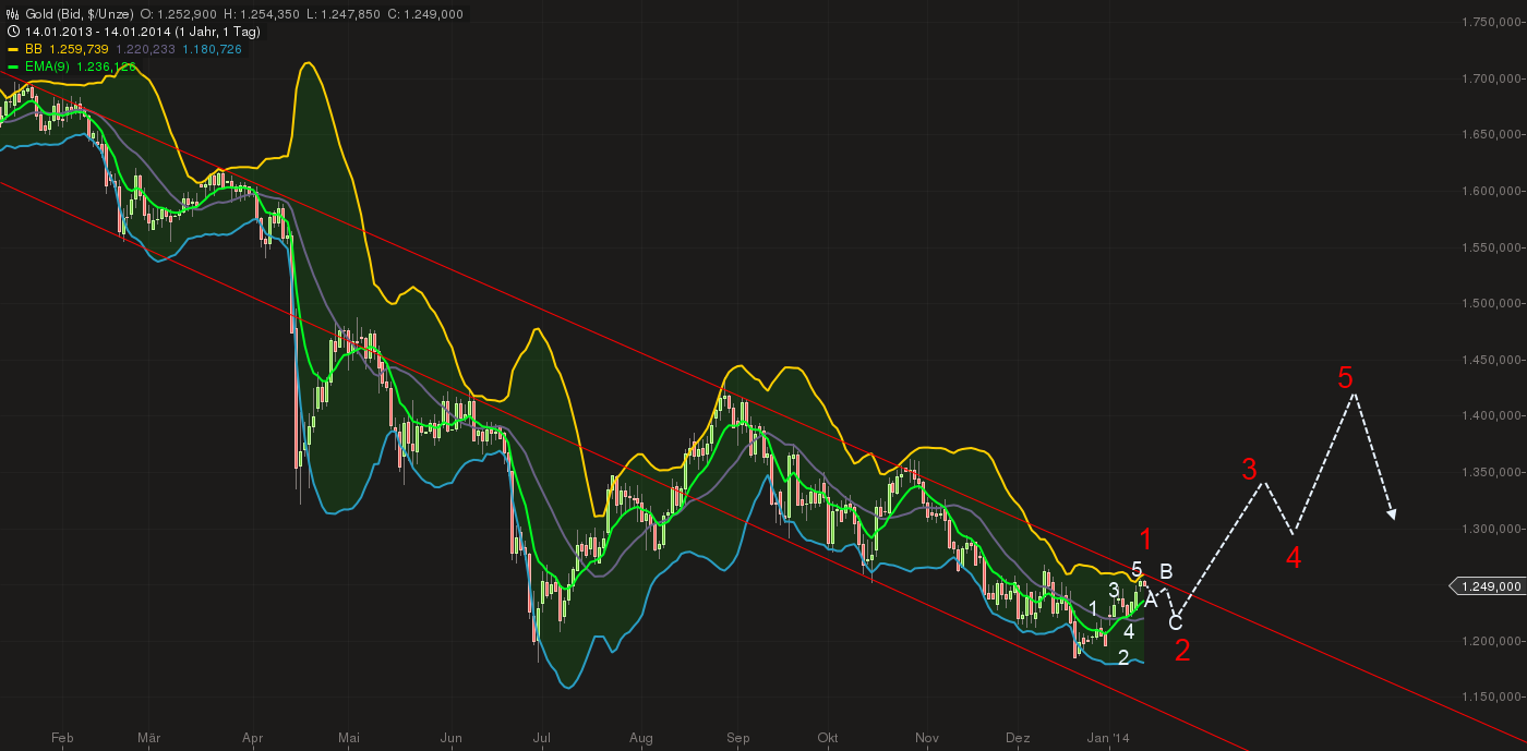 Zunächst ist Gold am oberen Abwärtskanal angetroffen. Gleichzeitig ist das das Ende der kleinen Elliott Welle 5....na...ja...bis 1260 wäre noch Platz für die kleine Welle 5....