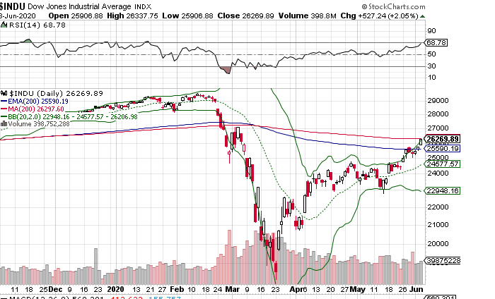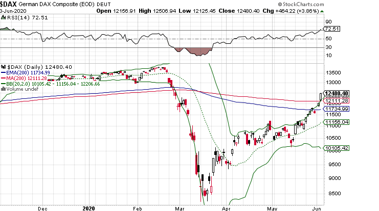 Im Tages-Chart wird der Übertreibung sehr deutlich, denn der ganze Körper der heutigen Tageskerze ist komplett außerhalb des oberen bollinger bands. Wenn die Börse noch halbwegs "normal" funktioniert, müssten die Indizies nun fallen, im Dax erst unter 12400 per Tages- und Wochenschlusskurs und dann Richtung ca. 11600, wo das offene gap wartet. Die 11600 wären ein Mindest- und kein Idealziel! Ein Wochenschlusskurs unter der 200-Tagelinie (SMA) hätte Signalwirkung und könnte bärentechnisch Wunder bewirken. Mal schauen...