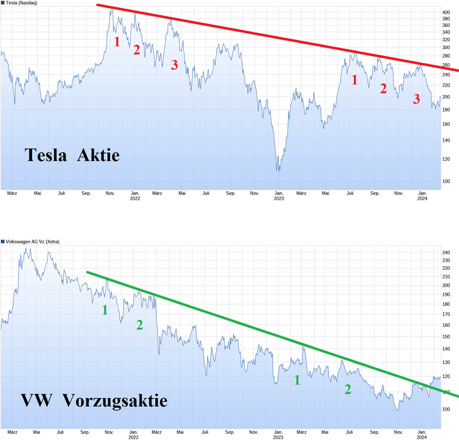 Im Gegensatz zu Tesla zahlt VW regelmäßig Dividende. Und für 2023 gibt´s aller Voraussicht nach gegenüber 2023 sogar noch etwas mehr. Übrigens sind die Jahre 2023 und 2024 laut Konzernfinanz nur Übergangsjahre. Richtig Geld wird ab 2025 verdient. Meine These: Wer weiß, ob´s bis dahin dieses amerikanische Elektro-Glump noch gibt?