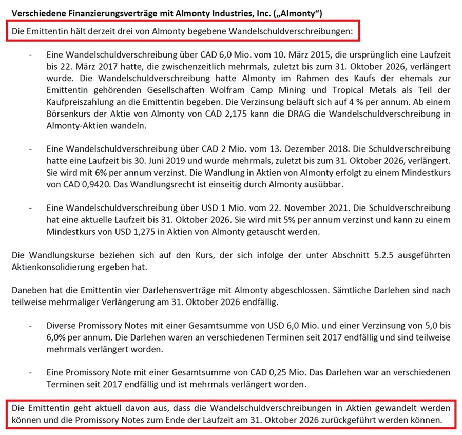 Im Wertpapierprospekt auf Seite 100 (siehe unten) schreibt die DRAG dass Sie an Almonty 3 Wandelschuldverschreibungen begeben habe, und dass die Emittentin davon ausgeht, dass am 31.10.2026 alle in Aktien gewandelt werden.