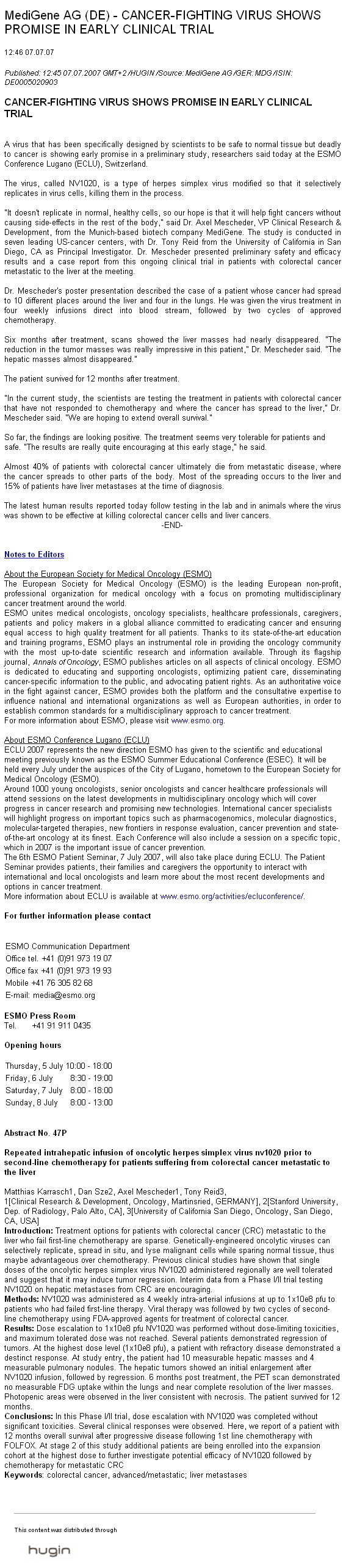 Der Aktienkurs ist stark unter Druck und das bei hohen Umsätzen was immer als schlecht zu interpreteren ist.Ein Händler auf dem Parkket sagte:Die Anleger flüchten aus diesen Wert.Rückblick : als Medigene im Jahre 2000 an die Börse ging als Hoffnungsträger tendierte der Kurs noch um die 100Euro danach viel der Kurs nurnoch, nur 7jahren später hat sich der Kurs auf ein 20zigtel des Basiswert(100) reduziert .Klar waren die Kurse im Jahre 2000 stark überzogen aber wer mal auf Gpc schaut oder Morpho dann sieht man wer seine Hausaufgaben gemacht hat und wer nicht!
