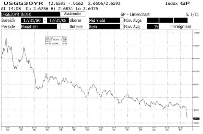 Nachdem ein Bild mehr als tausend Worte sagt, präsentiere ich den Chart für die Renditen von 30-jährige-US-Staatsanleihen zwischen 1981 – Ende 2008: