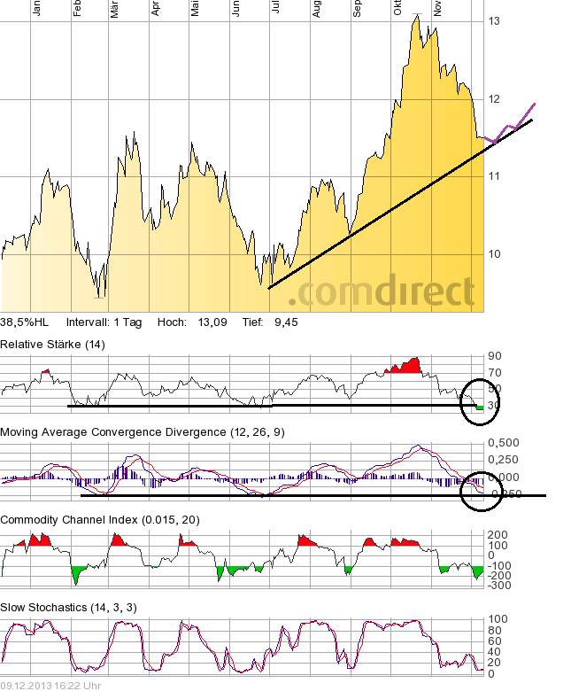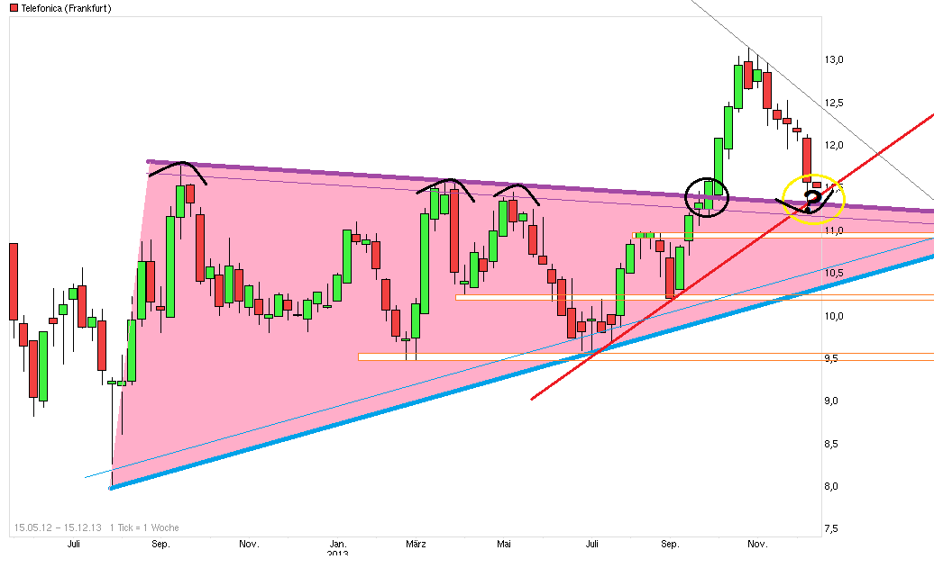 Der Rücksetzer in deinem Chart ist in erster Linie bedingt durch den ex-div Tag - sprich Telefonica zahlt wieder Dividende (so um den 06.11.2013 bei mir am Konto) - 0,35 - wobei die sofern sie es so machen wie früher 2 x im Jahr ausschütten