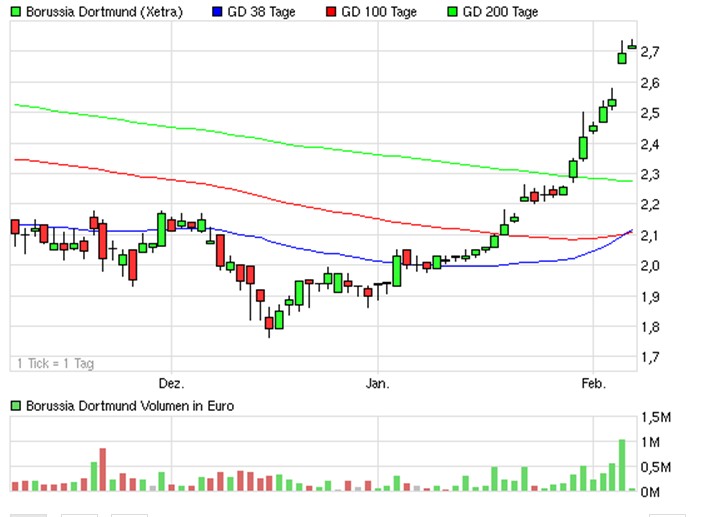 Gerade hat Borussia ein bullishe Kreuzung (GD38 von unten durch ein wieder steigender GD100) hinter sich.
