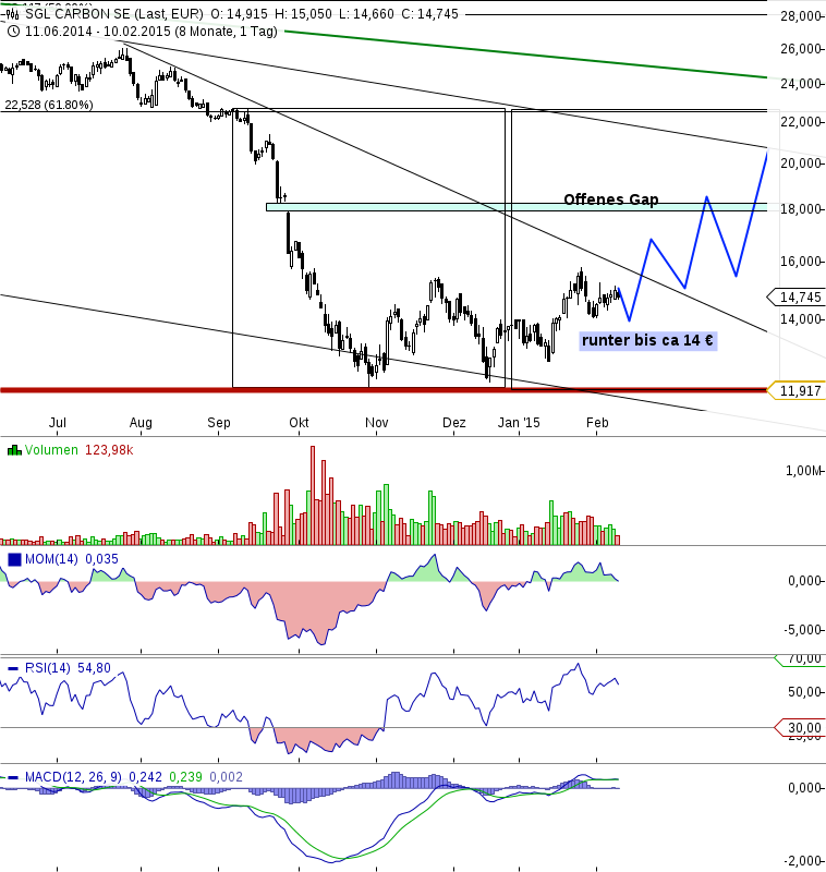 von dort aus folgt der durchbruch von der kurzfristigen abwärtstrendlinie bei ca 15,50- 15,80 €.