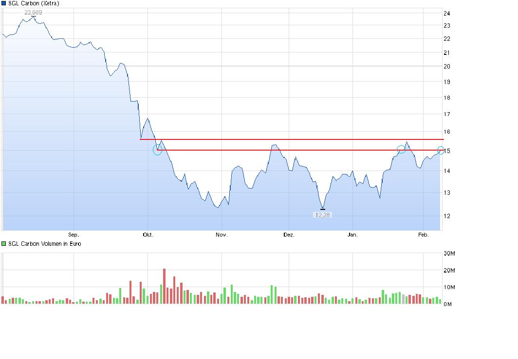 Erfahrungsgemäß macht derjenige das meiste Geld mit einer Aktie, der einsteigt, wenn sie keiner (mehr) haben will. Diesen Punkt scheinen wir bereits überschritten zu haben. Jedenfalls ist dann, wenn der SGL-Kurs ruhig seine Bahnen zieht, die Katz bereits den Baum rauf.