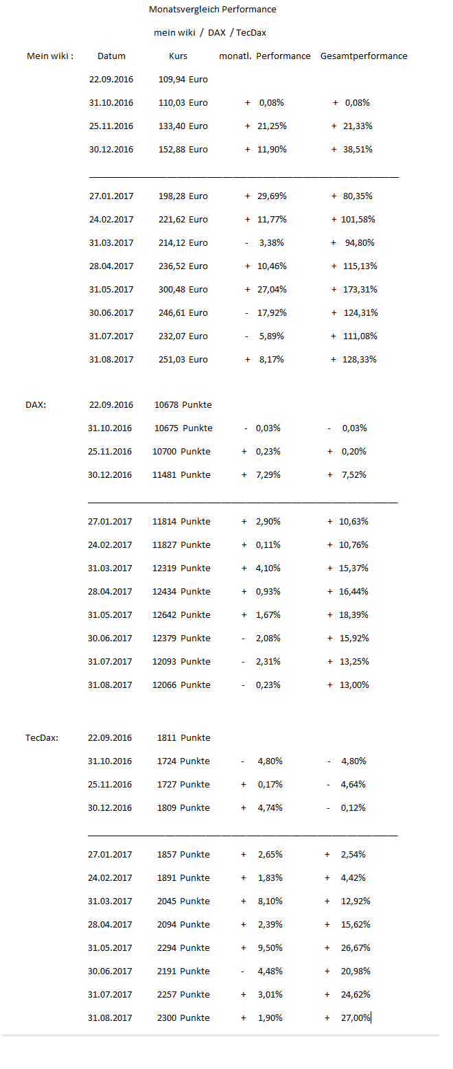 So der Monat August ist vorbei und der Gesamtmarkt performte unterschiedlich. Der DAX verlor den dritten Monat infolge an Wert wenn auch nur leicht mit 0,3% hingegen z.B der TecDax gut zulegen konnte. Nach zwei Monate mit negaiver Performance konnte mein wiki im August wieder zulegen und zumindest den letzten Monat Juli schon einmal wieder komplett ausgleichen. Natürlich bin ich so lange nicht zu 100% zufrieden bis mein wiki wieder ein neues ATH markiert aber in einem schwachen Gesamtmarkt ist das natürlich schwierig. Ich rechne allerdings damit das sich die kommenden 4 Monate besser entwickeln werden als die letzten 3 Monate und somit mein wiki ebenso. Damit bleibe ich sehr optimistisch in den kommenden Monaten wieder deutlich bessere Kurse in meinem wiki zu erreichen.
