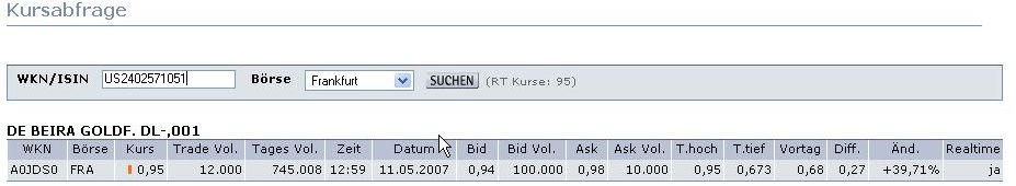 ....De Beira ist kein reiner Explorationswert; sie ist bereits ein kleiner Goldproduzent - für das Kalenderjahr 2007 wird eine Produktion aus Ekuador von 20.000 bis zu 25.000 Unzen erwartet....