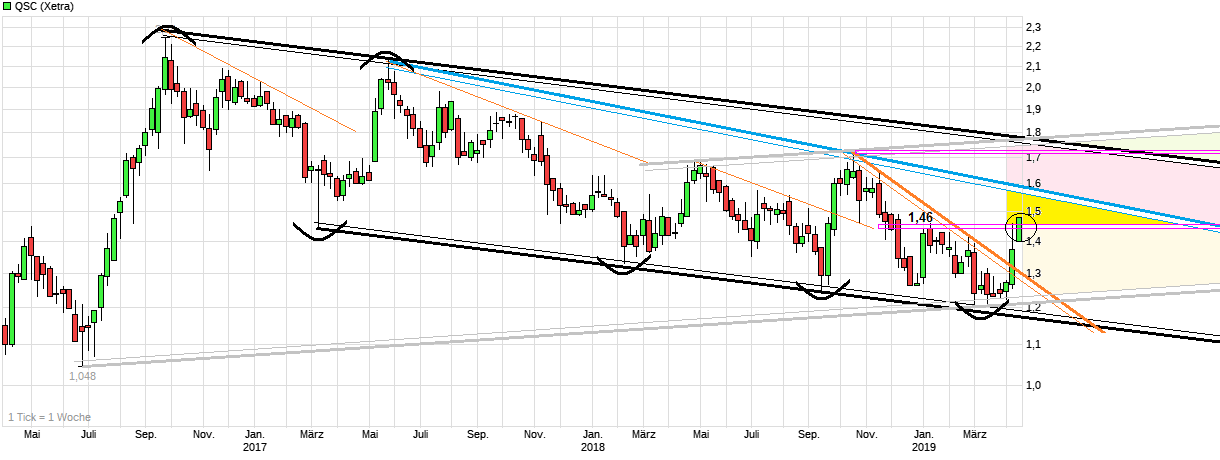 Ende der Woche ist man über 1,46 gestiegen, d.h. dem Top vom Jahresanfang. Das muß jetzt verteidigt werden. Sollte man die Kraft haben sich bis zur oberen Seite des schwarzen Abw.trendkanals zu arbeiten, dann wären noch ca. 25/30 Cent Luft bis dahin nach oben (wobei diese Linie stetig weiterfällt und damit der Abstand auch mit der Zeit geringer wird). Sollte man nur bis zur blauen Abw.trendlinie laufen und sich damit weiter in einem Keil abwärtsbewegen, dann wären noch ca. 10 Cent Luft nach oben. Mal schauen was also die nächsten Wochen bringen. Im Mai gibt es wieder die Q.1 Zahlen und die HV. Da könnte man erste Eindrücke bekommen, ob die 2019er Prognose zu konservativ ist und ob sich was bei Netzverkauf zeitlich tut. Ratschlag an das Management wäre (neben dem Verkauf des Netzes) einen SpinOff des Cloud-Bereichs in Zukunft zu erwägen, wenn der Bereich noch etwas größer wird. Damit würde man dann etwas dem Konglomeratsabschlag entgegenwirken. Gibt sicherlich viele Anleger die lieber ein Huhn kaufen wollen was Eier legt ohne stets dazu noch 6 alte magere Hühner mitzukaufen, die keine Eier mehr legen.