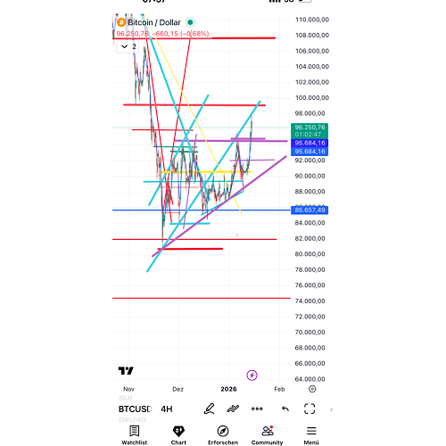 Danke Mike! Motiviert mich zeitweise auch wieder den einen oder anderen Swingtrade (gehebelt) zu versuchen. Ermöglicht einfach auch in negativen Phasen einen Ausgleich zu schaffen. Was meinen Ausstieg betrifft, wollte ich einfach verhindern, einen gut möglichen Rücksetzer nicht mitzugehen. Der Kurs hat es lt. meinem Chart nun genau an eine massive Widerstandszone (98000-99000 + 100k) geschafft und ich glaube nicht, dass es da ohne vorherigen Rücksetzer durch geht. Ein weiteres höheres Tief 92-95 würde dem ganzen mE auch mehr Stabilität geben. Mal sehen. Kommt der Rücksetzer gehe ich unten wohl nochmal long (short dzt keine Option) und geht es durch - umso besser dann lacht das Depot ohnehin.
