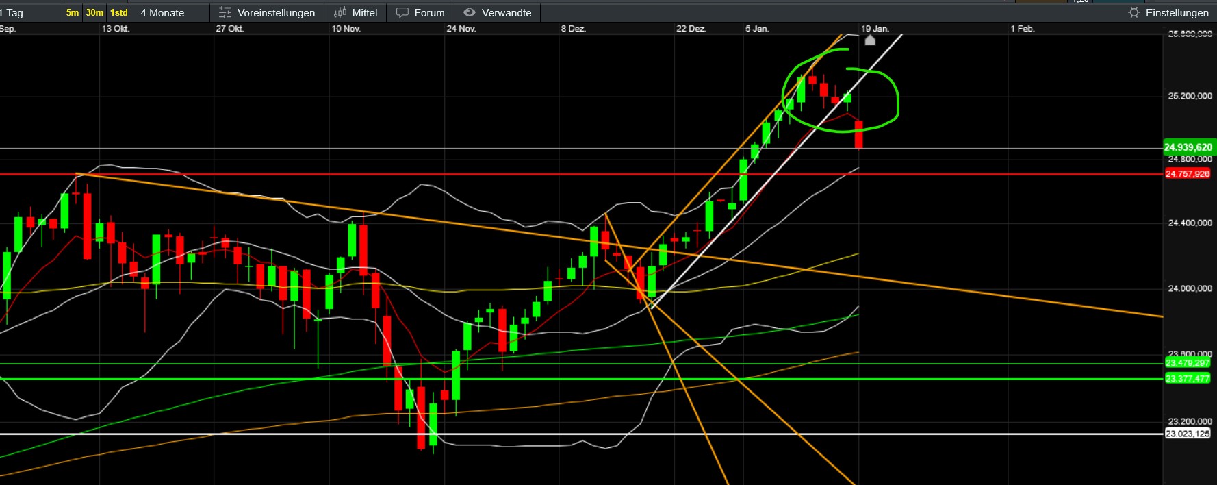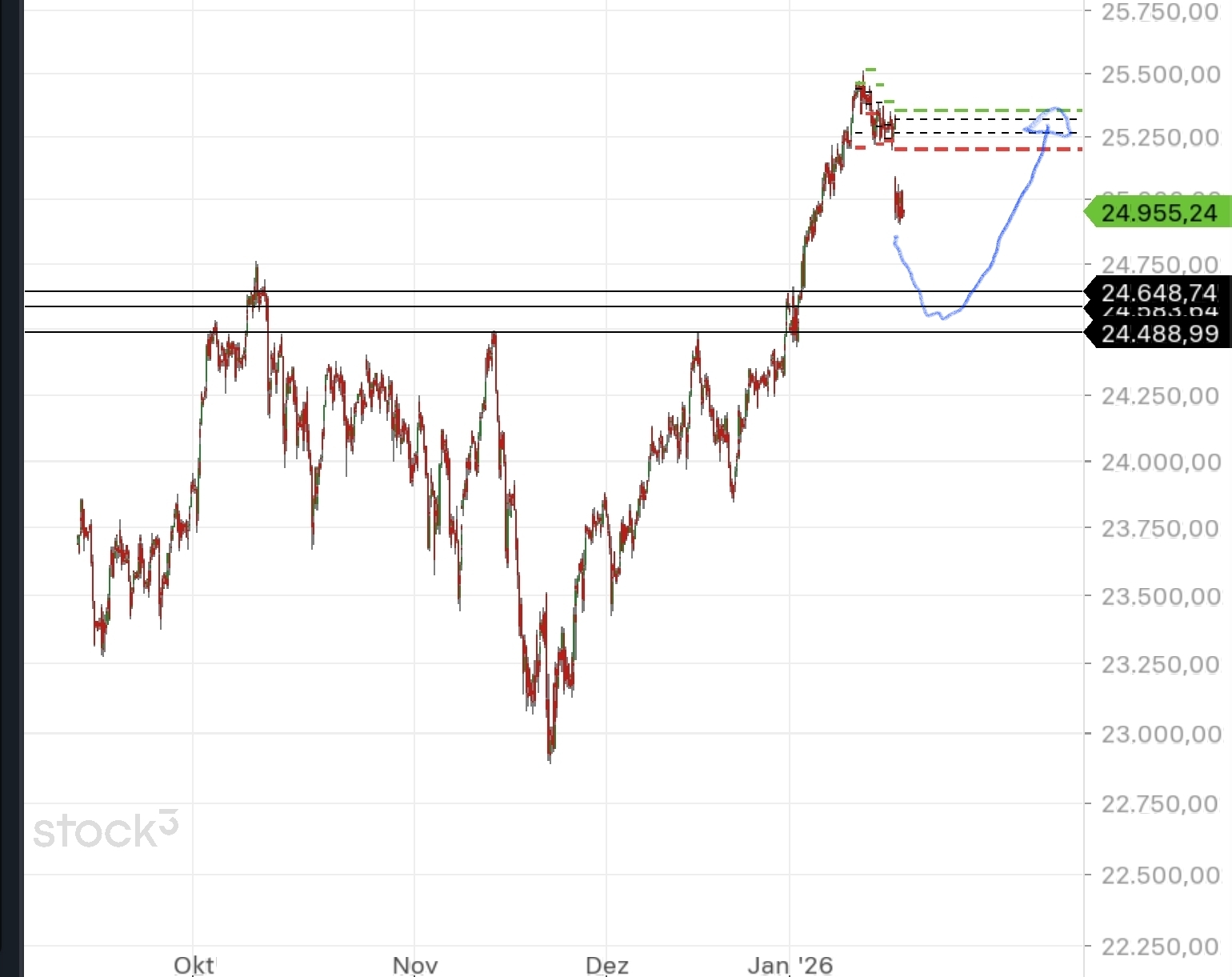 und wie immer sehr unaufgeregt dargestellt! Und just heute könnten wieder die Rufe nach "Rutsche" und es geht jetzt "alles nur noch bergab" aufkommen: in der frühen Bewegung knabbert er gerade an der unteren Begrenzung des steilen Kanals. Evtl. nur Fehlausbruch oder (gesunde) Konsolidierung, die die Tage sogar bis ca. 24.750/780 gehen könnte, wobei der mittelfristige Up-Kanal seit dem 21.11.2025 dort seine untere Linie hat (zumindest in meinen Zeichnungen). Ergo wäre ein Rückgang bis dahin überhaupt kein Problem, aber allein die Bewegung Wasser auf den Mühlen unserer Panik-Propheten...