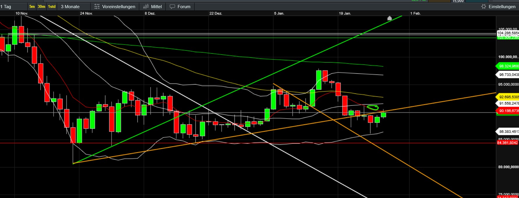 Nach wie vor ermüdend genauso wie dass mein Text jetzt 3x abgestürzt ist… daher nur Chart und die Feststellung, dass die 89000-92000 wichtig wären zu überbieten. Ist aber unwahrscheinlich daher würde sich eventuell sogar ein Short anbieten. Unten zumindest kein Beinbruch solange die 86000 hält…Max. Ziele oben allerdings mittlerweile auch mau (98000, 102000 etc)…