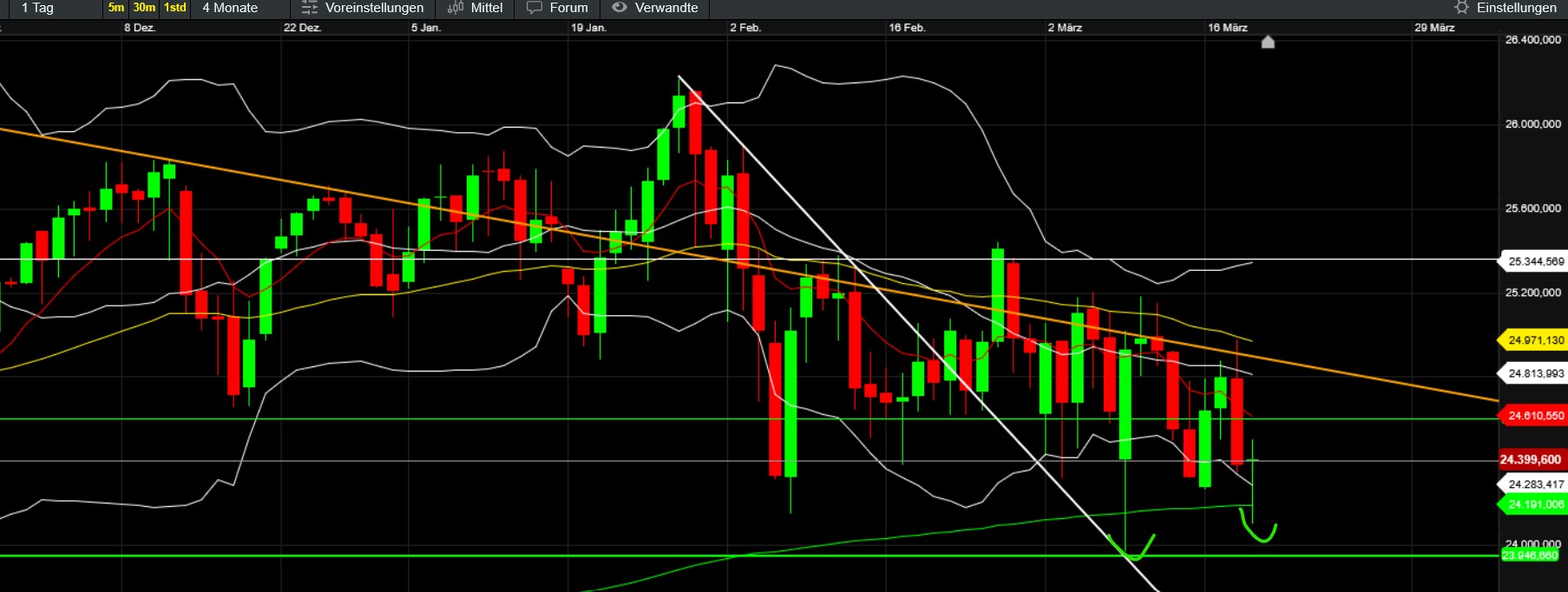 Der Markt hat die Zone um 23.334 klar verloren und ist auch unter die EMA(200) bei ca. 23.835 gefallen.