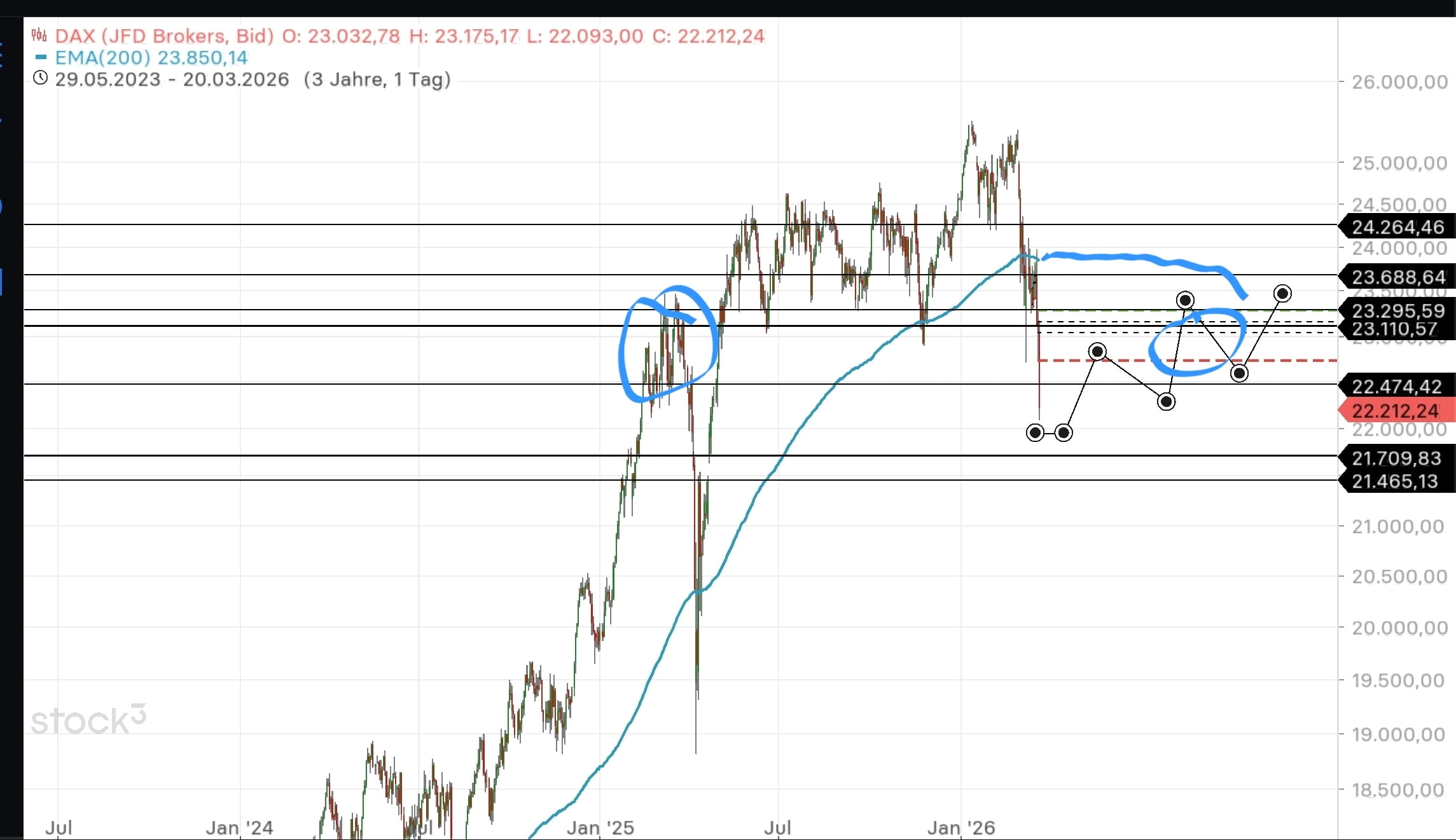Der DAX ist charttechnisch klar angeschlagen, liegt aber direkt an einer wichtigen Unterstützungszone; oberhalb von 22.764 wäre ein Rücklauf denkbar, unter 22.380 öffnet sich eher Raum Richtung 21.723