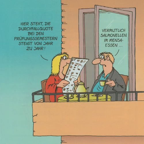 Sagt der Kollege: „Kein Problem, wir schieben ein Brett raus und stellen uns hinten als Gegengewicht drauf.“ Gesagt, getan. Als er auf dem Brett steht und pinkeln will, ertönt die Glocke zur Mittagspause. Die beiden hinteren springen vom Brett und holen ihr Mittagessen.