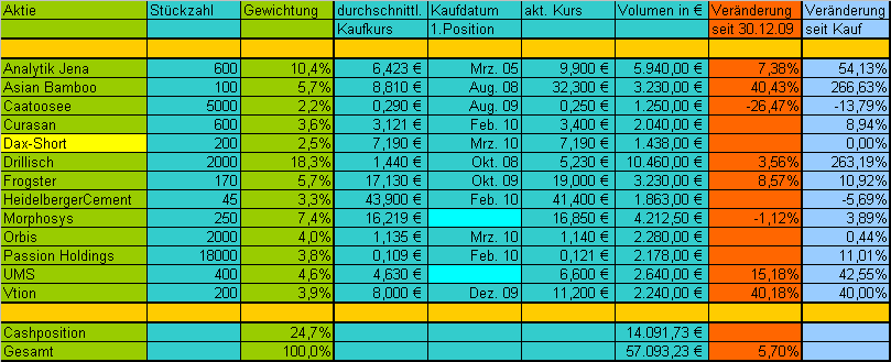 Deine Depotführung ist sehr interessant für mich, da ich das gleiche Feld beackere: Stockpicking vorzugsweise deutscher Nebenwerte. Bei der Titelauswahl gibt es zahlreiche Überschneidungen.