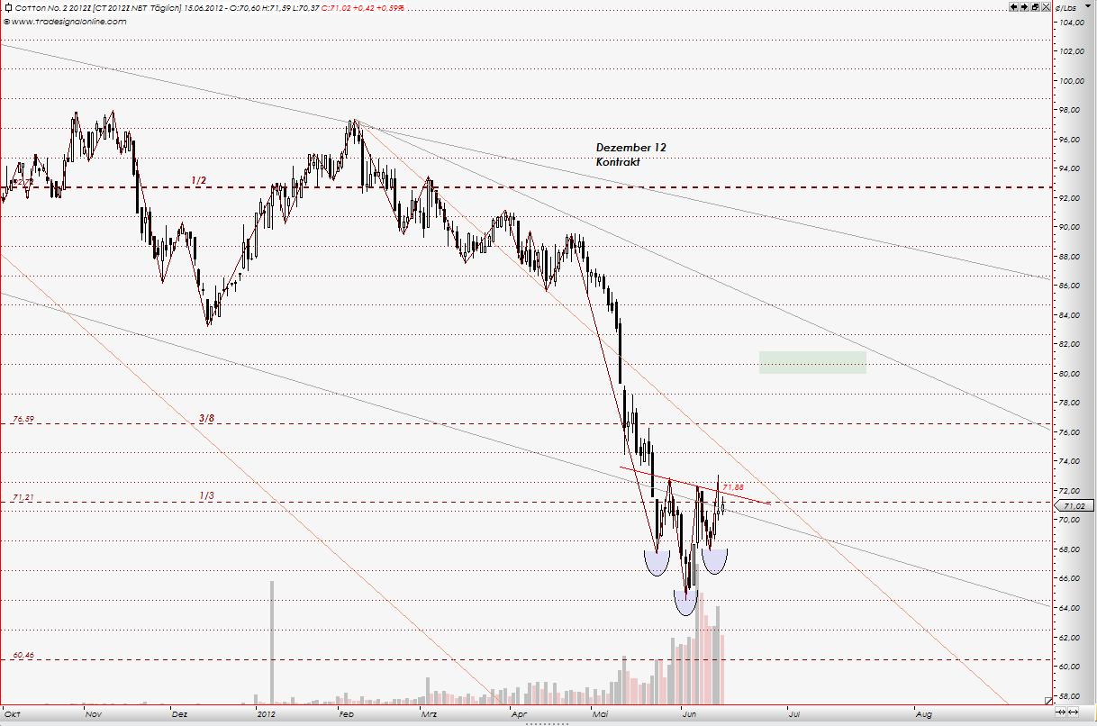 sind nicht ausgeschloßen.... im Dezember 2012 Kontrakt. Für aktuellen Kontrakt, Juli 2012, was ja dem Endloskontrakt zugrundeliegt, bedeutet das 74 us cent. Im Bereich zw. 74 und 76 liegen Unterstützungen für Juli 2012 Kontrakt, im Form der Gann Linien. Vor allem 73,55 - dort die 1/2 Gann Linie, berechnet aus der alten Handelsspanne zw. dem Hoch vom 1995 und dem Tief 2001 aller Juli Kontrakten.