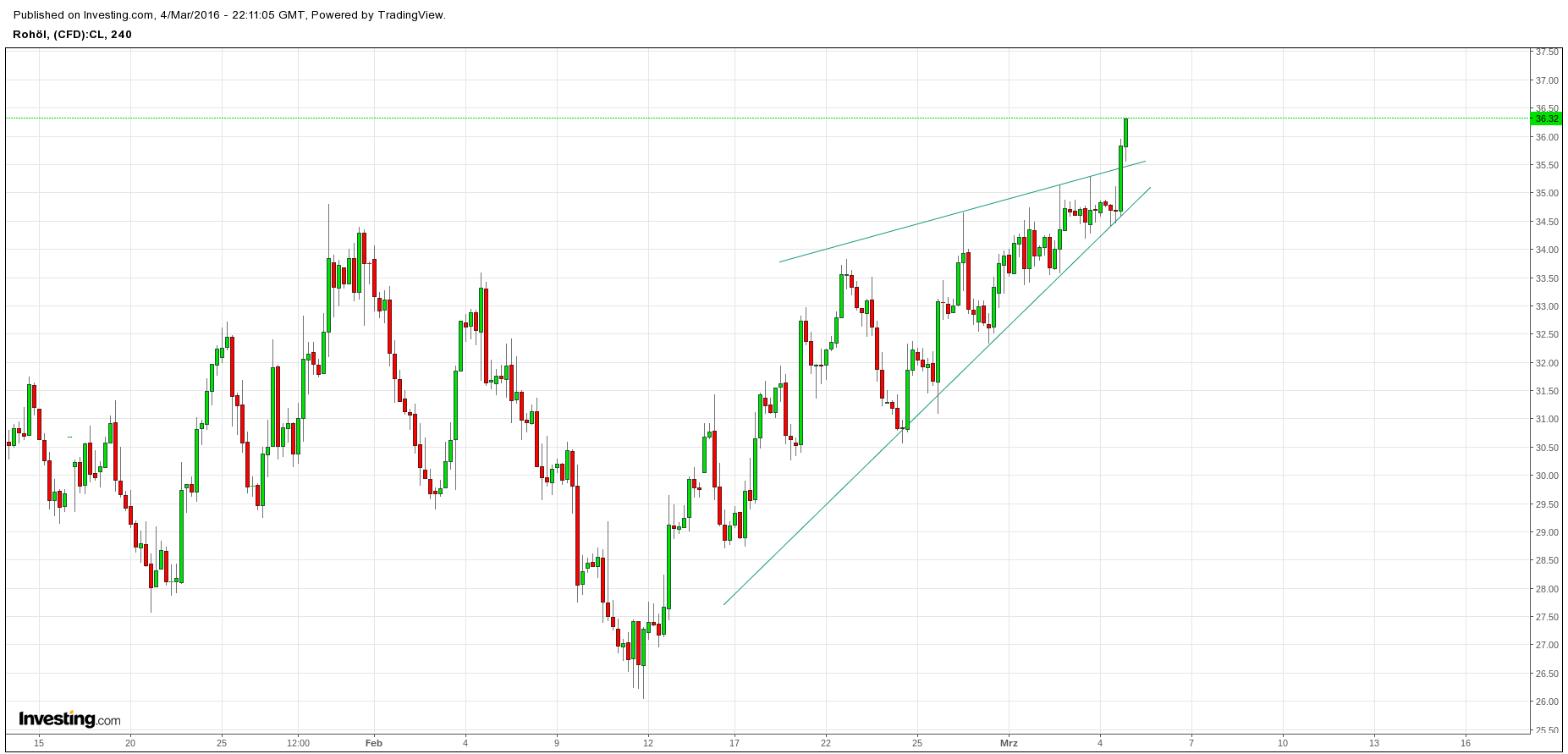 Beim Dow hat sich auch ein steigendes Dreieck gebildet was eventuell am 7 oder 8.03 nach unten auflöst. Bei Gold sieht es noch nicht besser aus. Dort ist der Kurs wohl ausgebrochen aber später wieder zurück gekommen ins steigende Dreieck.