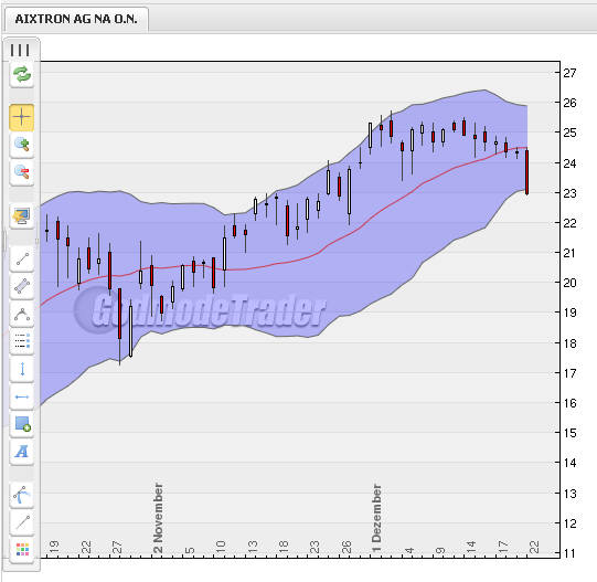 22.12.2009 (www.4investors.de) - Mitten in der vorweihnachtlich ruhiger werdenden Börse schläft auch die Volatilität bei der Aixtron-Aktie immer mehr ein. Die Aktie ist im Konsolidierungsmodus, ohne groß Terrain preis zu geben. Die Seitwärtsbewegung läuft oberhalb von 23,62 Euro und in größten Teilen oberhalb von 24,11 Euro. Die übergeordnete Aufwärtsbewegung ist damit weiter intakt, prozyklische Verkaufssignale sind bislang ausgeblieben. Die abnehmende Volatilität deutet aber darauf hin, dass hier bald wieder stärkere Bewegungen passieren könnten.