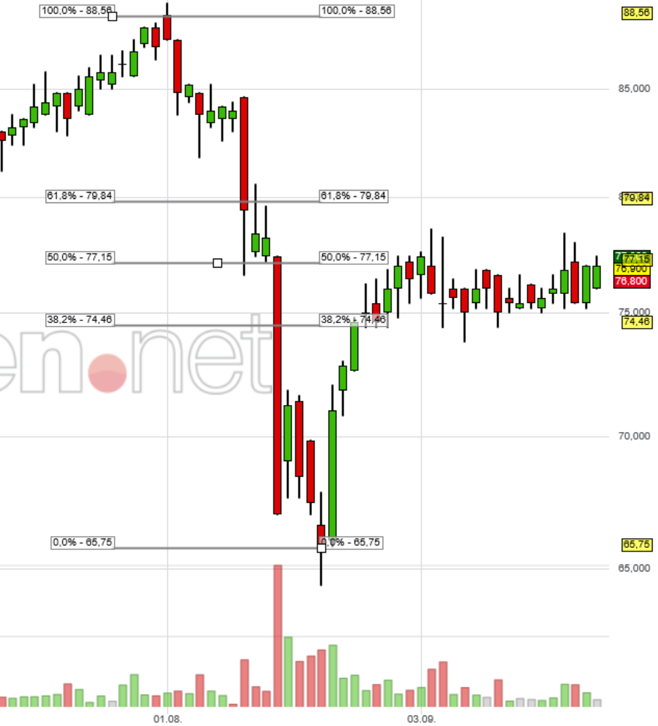 entsprechend Fibonacci hat der Wert Widerstand bei ca. 80 Euro (61,8%),